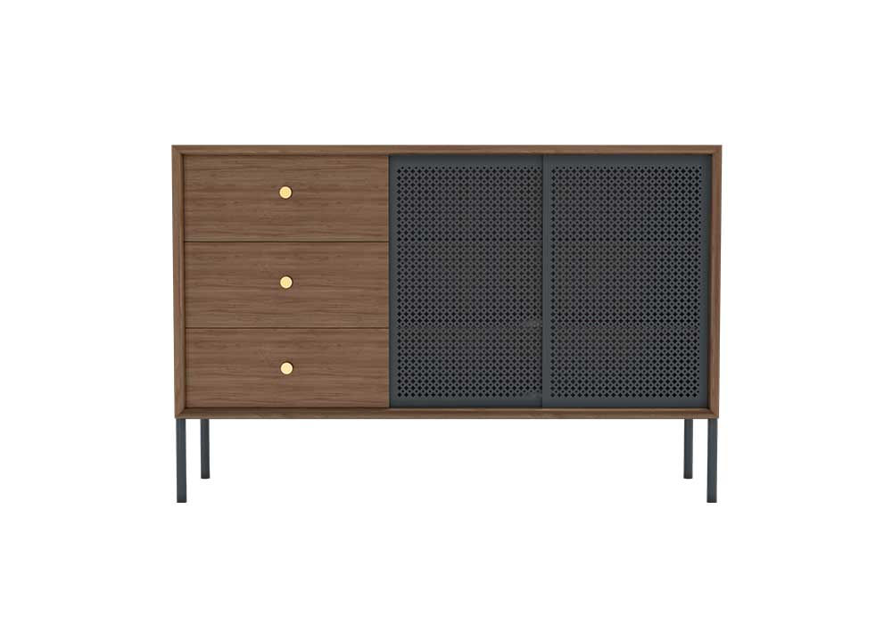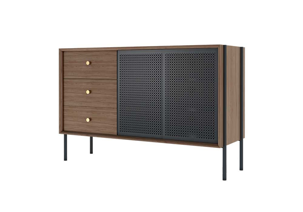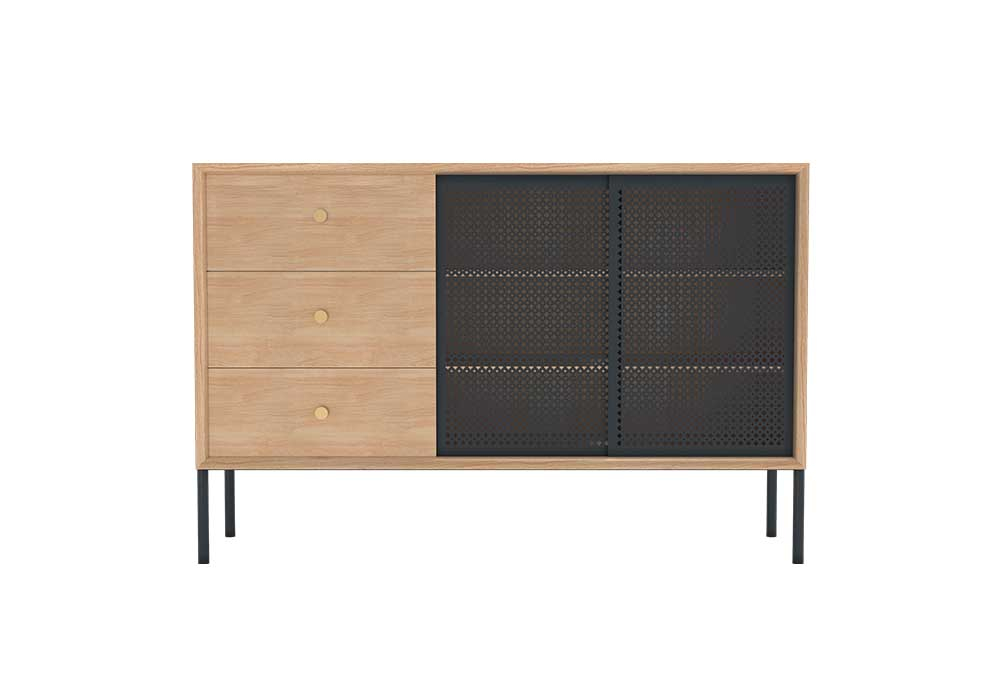 Placé avec élégance dans le séjour ou la salle à manger, le Buffet haut Gabin se distingue par sa présence imposante tout en apportant une touche subtile de délicatesse. Il arbore des lignes droites et contemporaines. Ce meuble, faisant partie de la collection du même nom, marie habilement le toucher doux du bois et un métal ciselé, évoquant la finesse d'une dentelle. Sa vitrine coulissante en métal perforé, inspirée du cannage des appartements haussmanniens, révèle une personnalité à la fois affirmée et raffinée. Ce buffet scandinave, conçu avec le plus grand soin au Portugal, présente une structure métallique gris ardoise texturé et bois, ainsi que deux portes métalliques ajourées en gris clair ou gris ardoise texturé. De plus, il offre trois tiroirs en plaqué chêne, chacun orné d'un élégant bouton en laiton brossé, ajoutant une touche d'attention délicate.